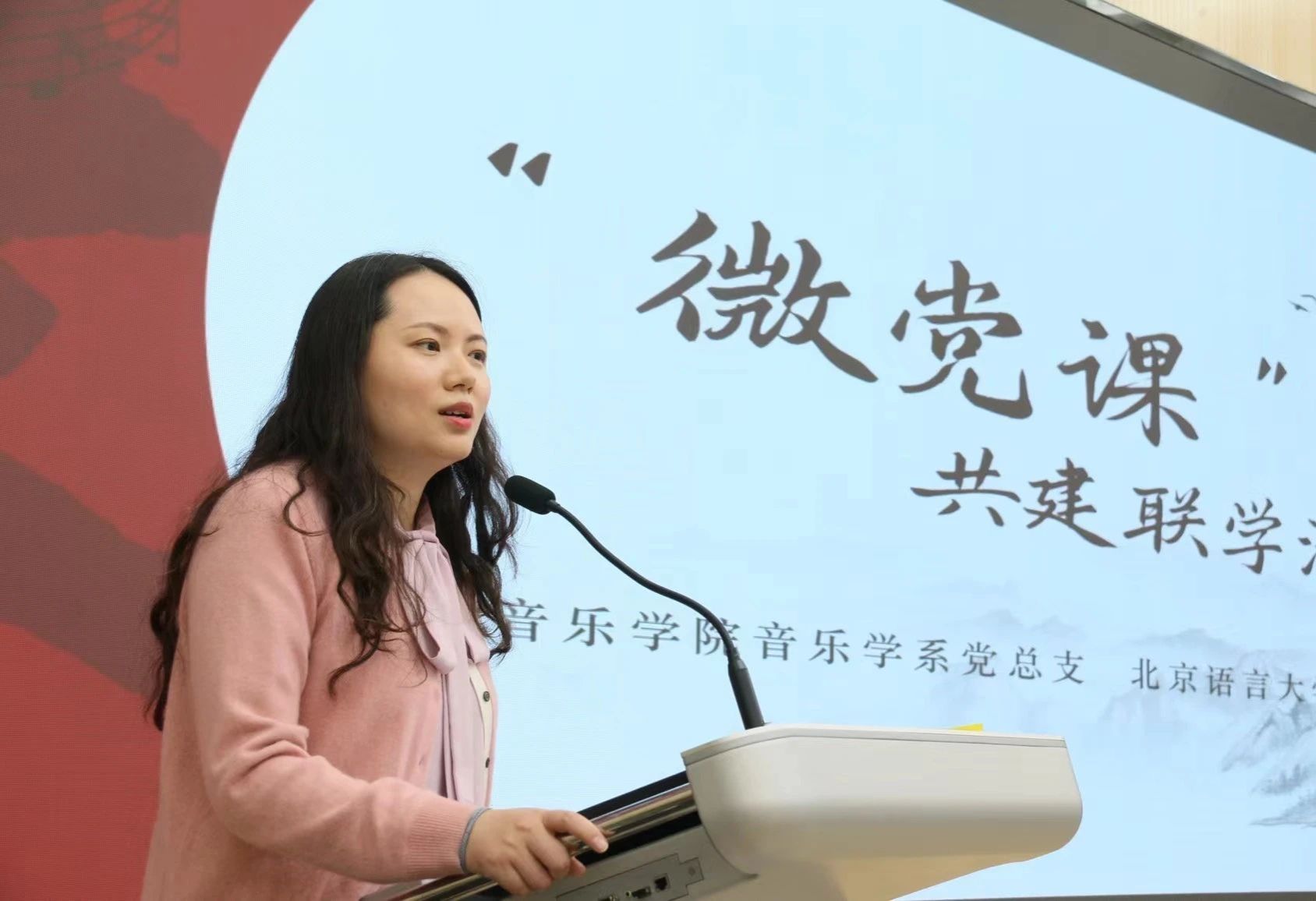 文学院党委副书记闫冬首先对中国音乐学院领导师生的到来表示了热烈欢迎与衷心感谢。并向大家介绍文学院的基本情况,详细介绍了学院院训、学科建设、师资情况、党建特色工作等。她指出,文学院致力于建设全国一流的中国语言文学学科,培养全国一流的文学与文化创新人才,打造全国一流学院。希望在本次联学共建活动中,双方发挥各自专业优势,用联学小讲台搭建党建大舞台,相互学习借鉴,共展党建风采。
