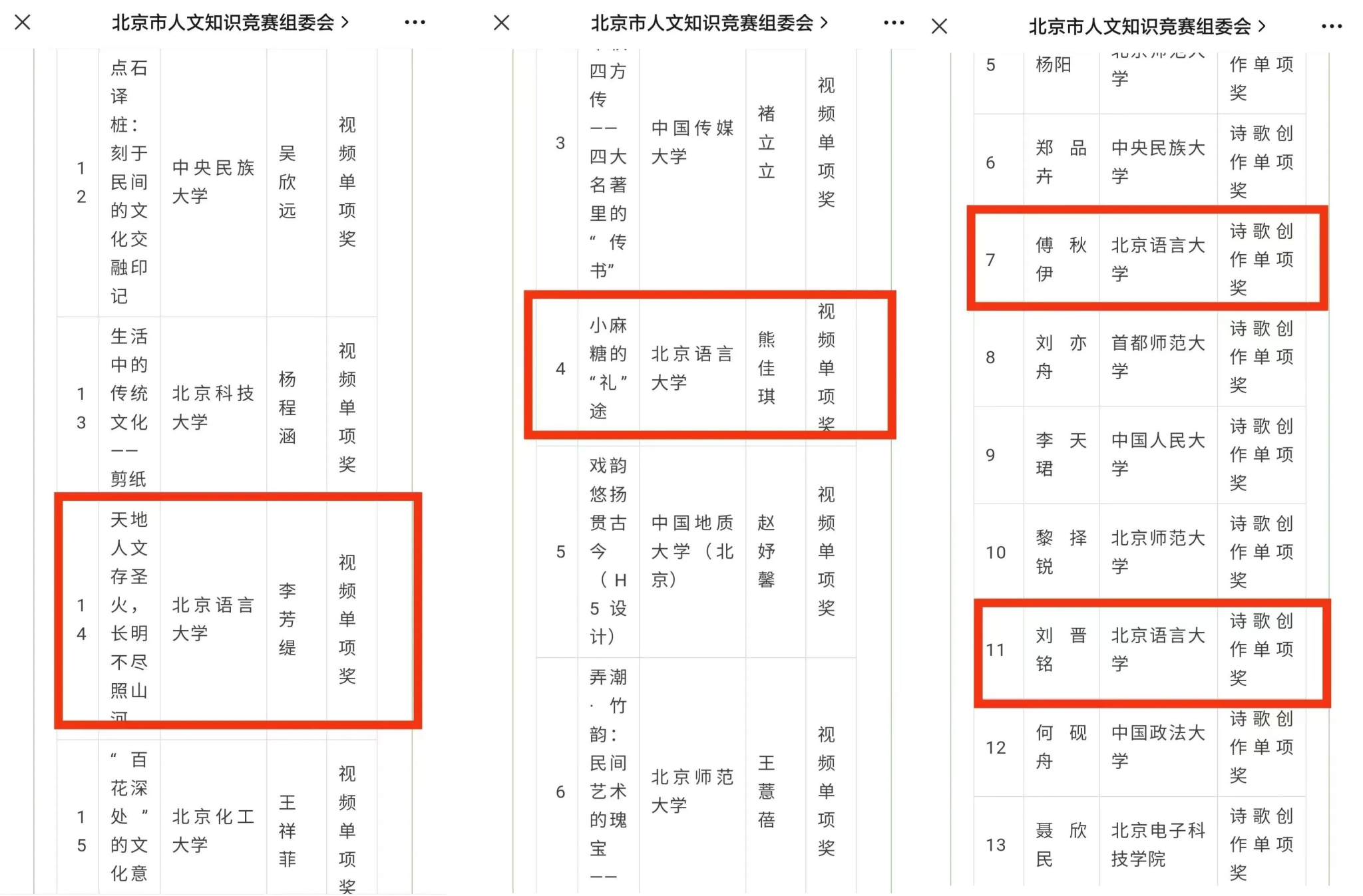此次同步公布了北京市大学生人文知识竞赛的单项奖,2021级汉语言文学专业本科生傅秋伊、刘晋铭2名同学获得北京市大学生人文知识竞赛诗歌创作单项奖;2021级汉语言文学专业本科生李芳缇、2022级汉语言文学专业本科生熊佳琪2名同学获得北京市大学生人文知识竞赛视频单项奖。此前,北京语言大学已有20名同学获得北京市大学生人文知识竞赛奖项,10名同学获得一等奖,8名同学获得二等奖,2名同学获得三等奖。其中,文学院共有14名同学获奖,竞赛成果丰硕。