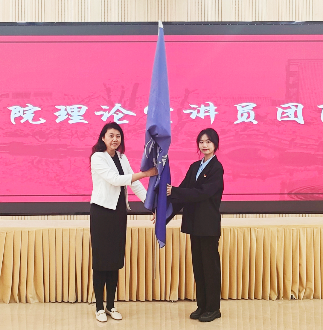 为进一步推动习近平新时代中国特色社会主义思想入脑入心,推动党史学习教育常态化长效化,带动更多同学以党的光辉历程和卓越成就鼓舞斗志,以党的光荣传统和优良作风坚定信念,以党的丰富历史经验和实践创造磨砺品格,文学院党委成立文学院学生理论宣讲队,文学院党委副书记闫冬为学生理论宣讲队授旗。