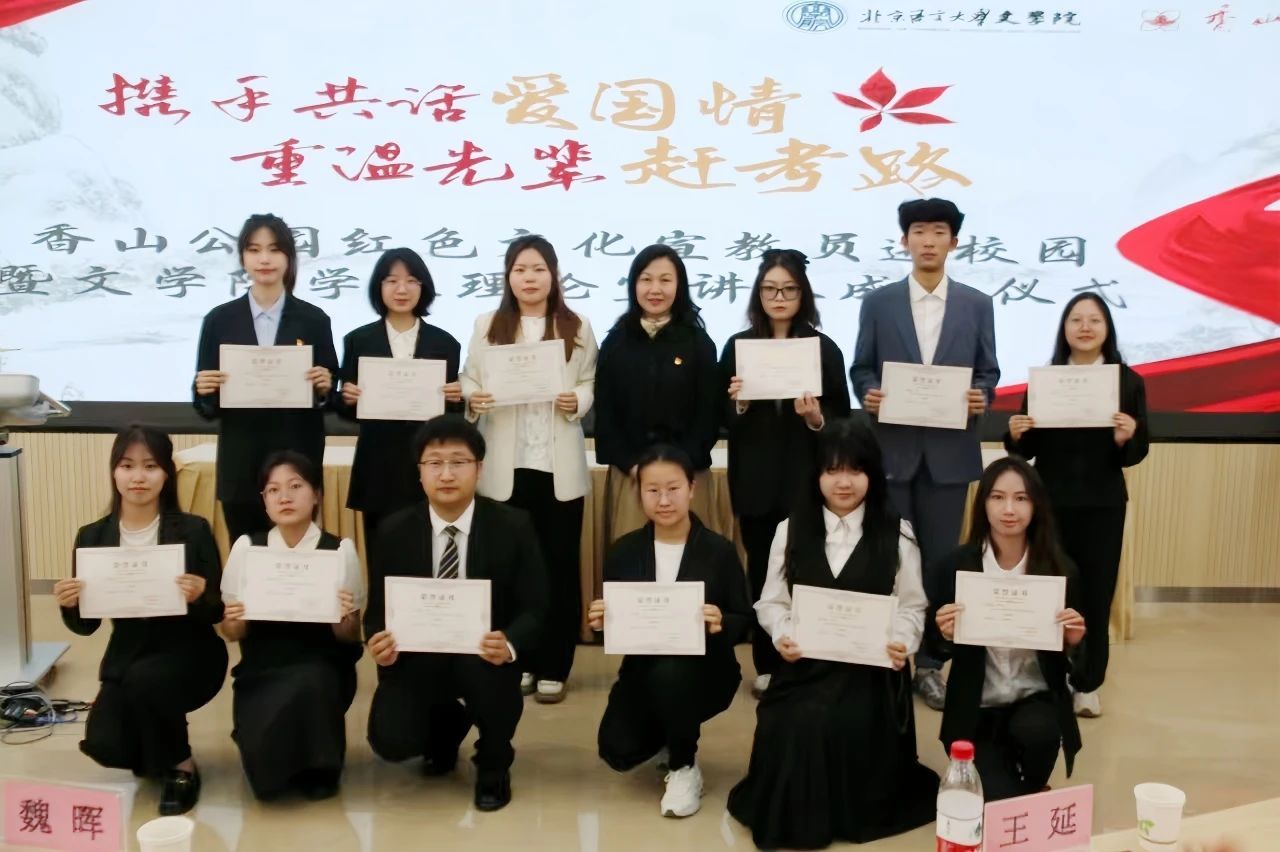 文学院副处级组织员林建萍为文学院文化理论宣讲员比赛获奖同学颁奖。香山公园爱教办副主任马丹、红色文化宣教员贾莉也代表香山公园为获奖同学赠送红色书籍以表祝贺。