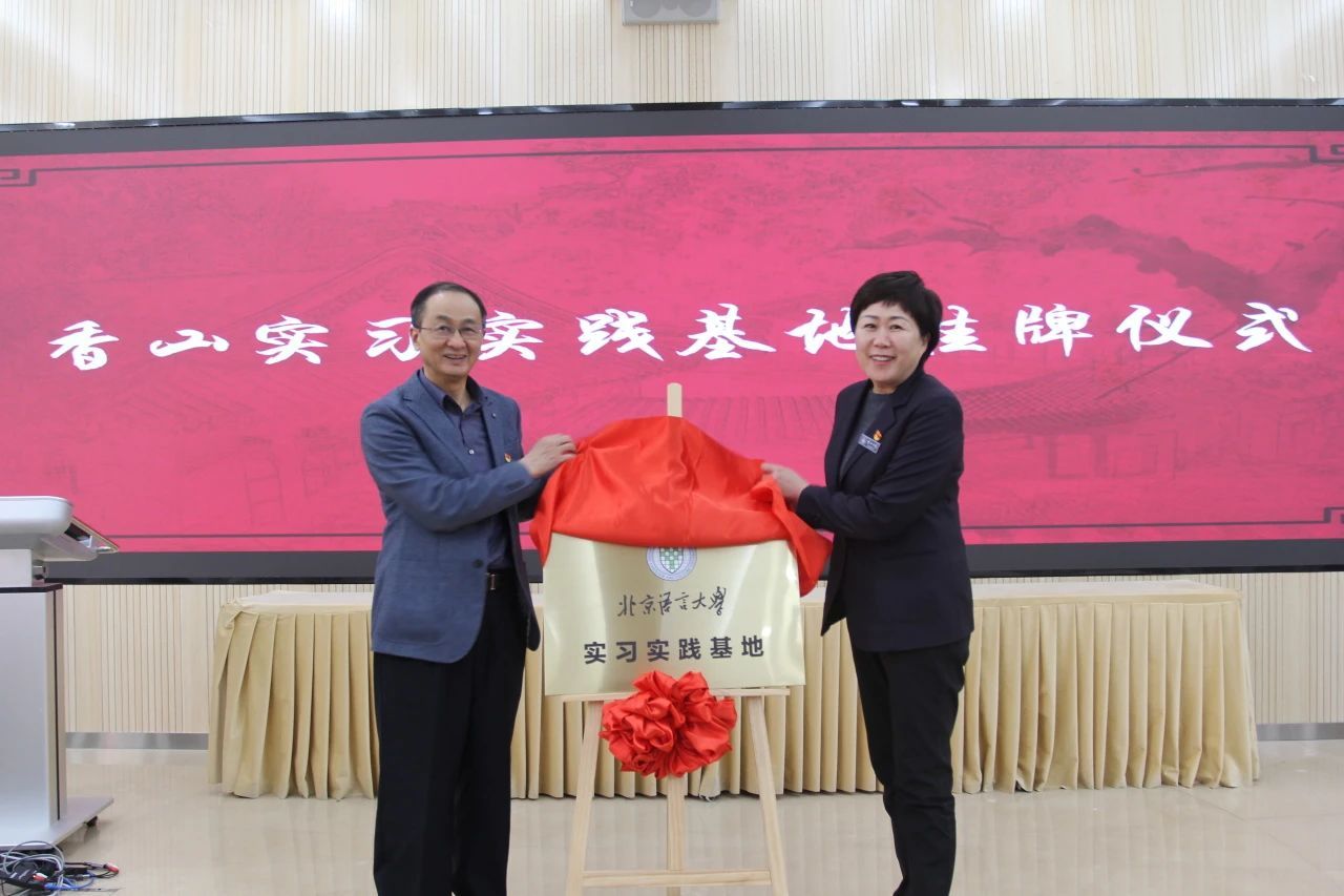 在本次活动中,校党委副书记魏晖与香山公园副园长王延为北语-香山实习实践基地揭牌。未来双方将继续携手共建,培育德才兼备的优秀人才。