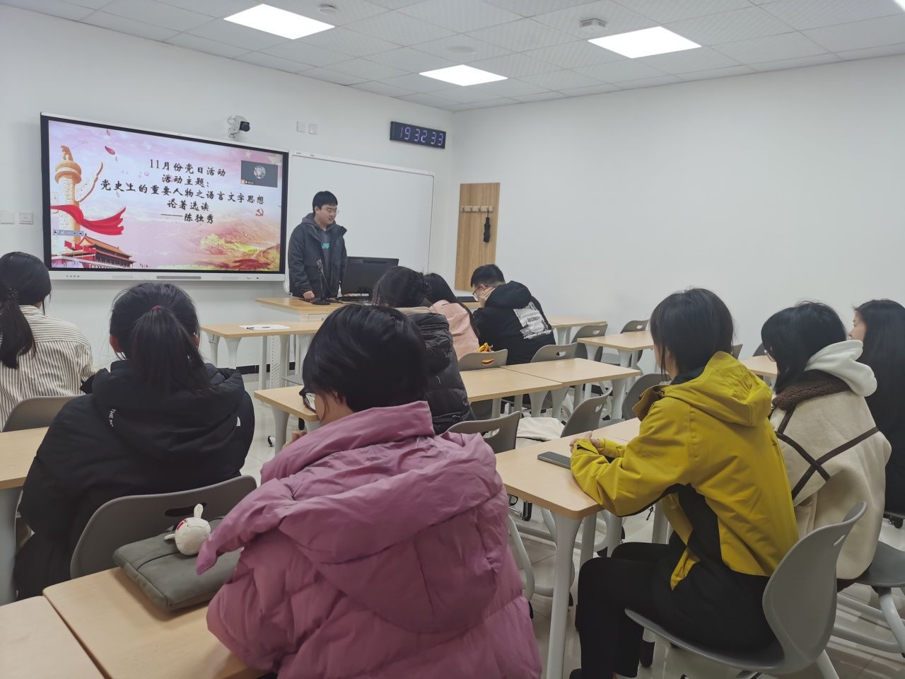 ②2023年11月10日,文学院博士生第一党支部于教二102开展了“党史上的重要人物之语言文字思想论著选读”主题党日活动。