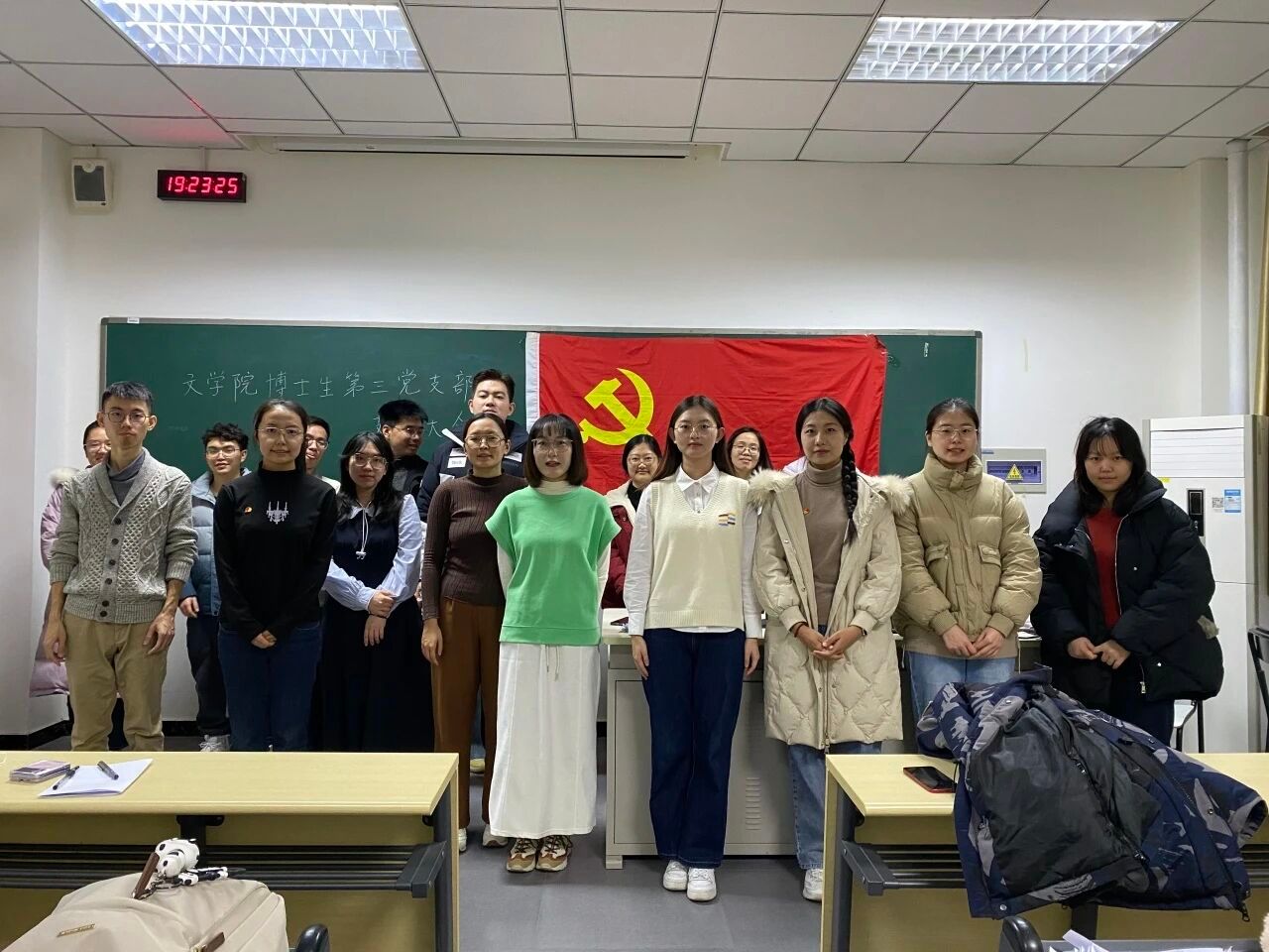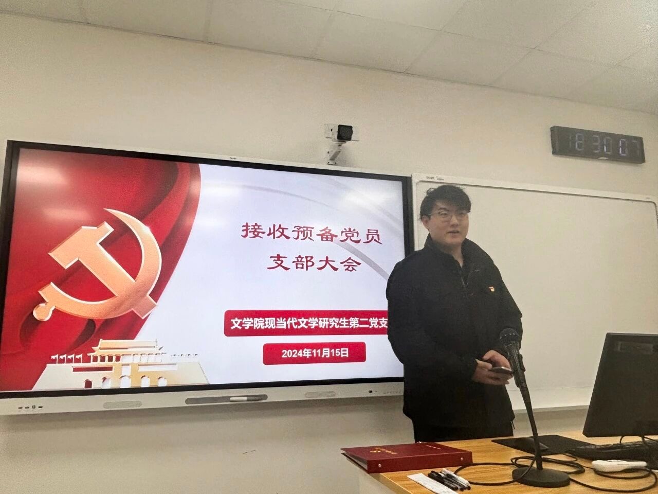 2024年11月28日晚,文学院博士生第三党支部于主南214教室召开预备党员发展大会,讨论接收杜美娟、王丹阳两名学生为中共预备党员事宜。