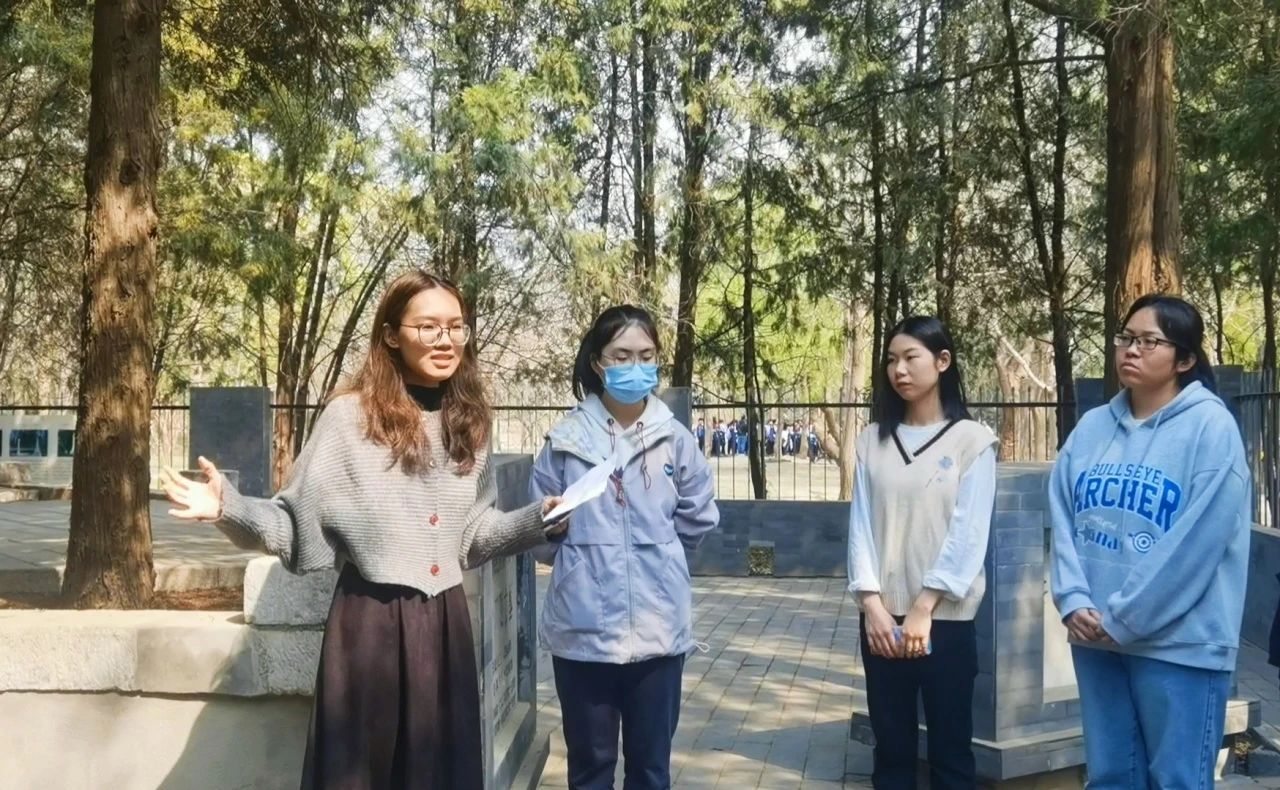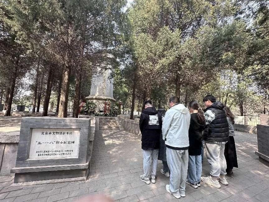 最后,同学们来到了三·一八烈士墓前。文学院文艺学比较文学研究生党支部书记张艺向同学们介绍了“三·一八”的历史背景,带领重读鲁迅先生的《记念刘和珍君》,走进时代的大潮。历史不容忘记,革命薪火代代相传。在张艺的带领下,同学们走进烈士墓,深度学习遗址故事,重温入党誓词,默哀敬礼后进行参观。