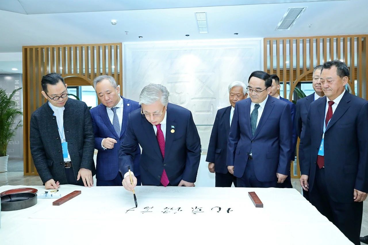 仪式结束后,托卡耶夫总统前往图书馆,与王光彦副部长、倪海东书记、段鹏校长、张霄大使等一同座谈,并与恩师刘士勤畅叙母校情谊。托卡耶夫总统还观看了其当年求学时期的珍贵资料并挥毫为母校题字留念。